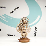 Beautiful gearing of the model includes an original 90-degree angle coupling you can observe when the mechanism is working. Along with a smart gears connection, Ugears engineers implemented another interesting feature: the unsynchronized clock hands sitting on the same axle. Each of them moves with its own pace.